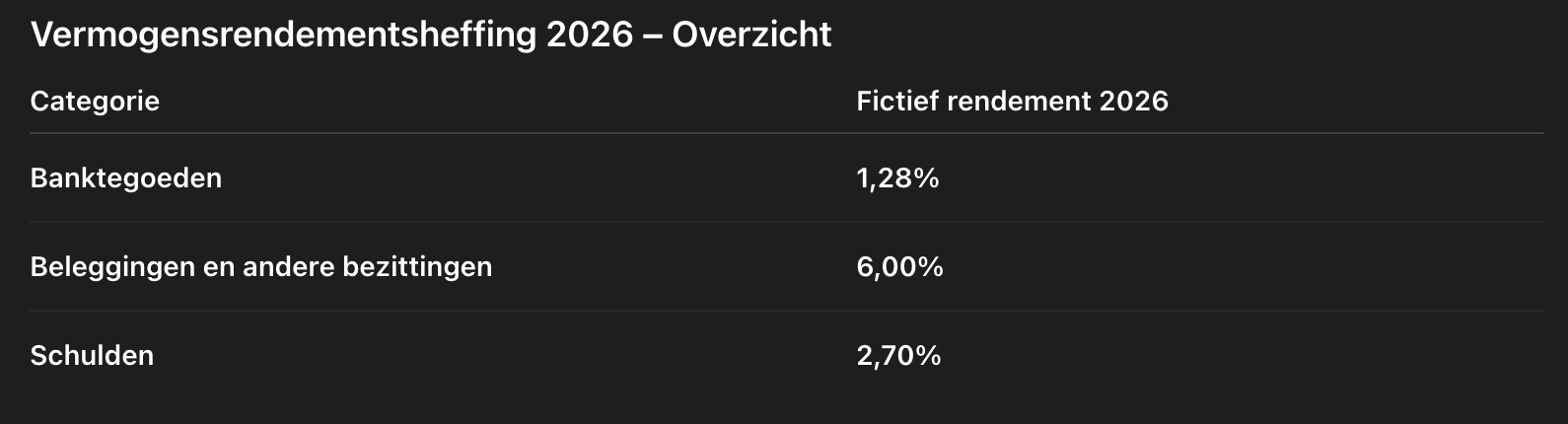 Voor belastingjaar 2026 werkt de Belastingdienst in Box 3 met fictieve rendementen. Het rendement voor beleggingen en andere bezittingen (zoals crypto) is vastgesteld op 6,00%. De percentages voor banktegoeden (1,28%) en schulden (2,70%) zijn voorlopig en worden begin 2027 definitief vastgesteld. Deze definitieve percentages worden gebruikt bij de definitieve aanslag inkomstenbelasting 2026.